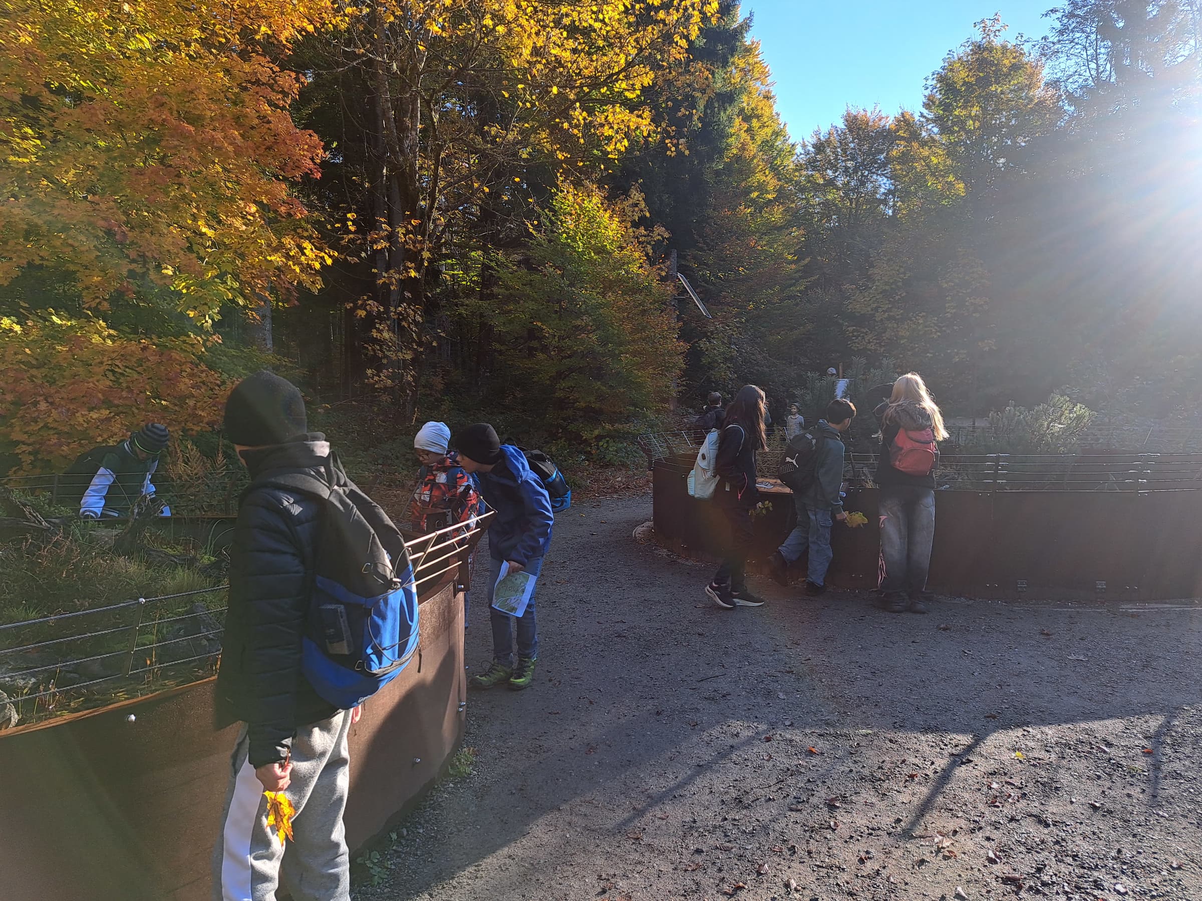 Der Tag begann mit einer etwa dreistündigen Wanderung durch das Tierfreigelände Neuschönau. Neben den vielen Tieren, die es hier zu entdecken gab, sollten auch verschiedene Rätselaufgaben gelöst und Gegenstände aus dem Wald gesammelt werden. Besonderes Highlight war der Bär, der direkt neben dem Weg seine Ruhepause abhielt.