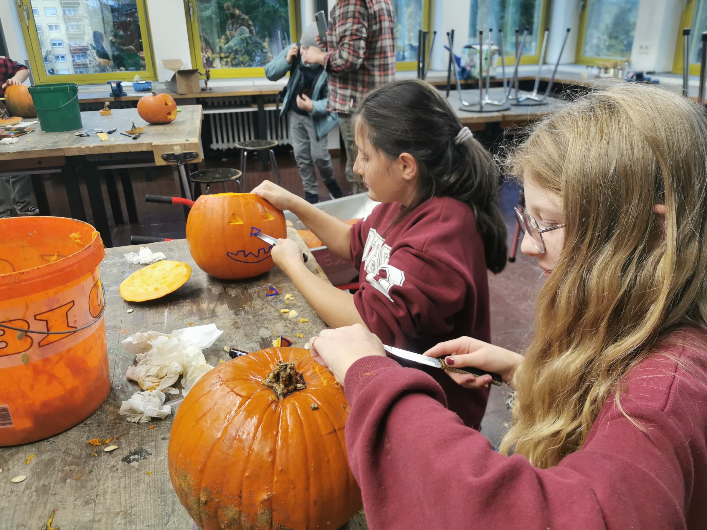Alle Schüler, die am Wahlfach Schulgarten teilnehmen, bekamen in der letzten Woche vor den Herbstferien ein besonderes Geschenk: Jeder durfte einen Kürbis schnitzen und mit nach Hause nehmen.