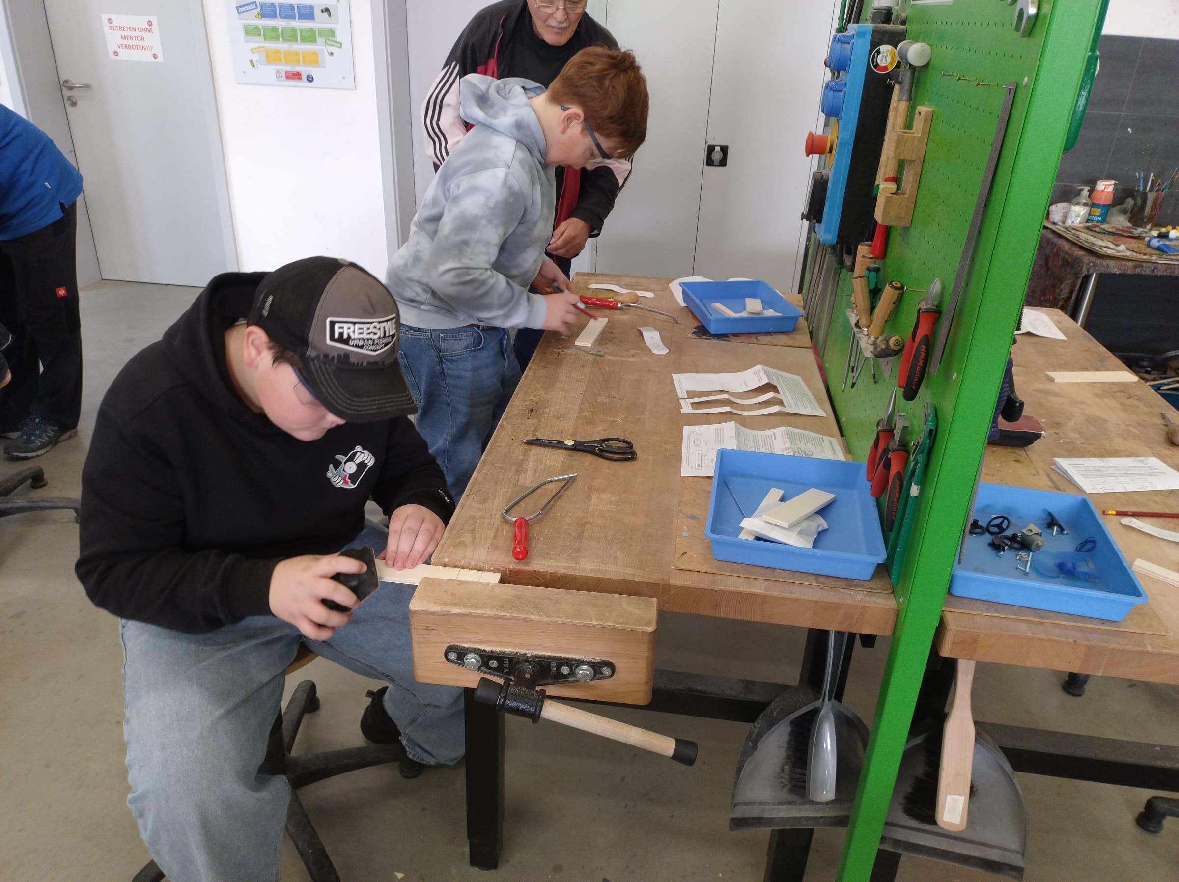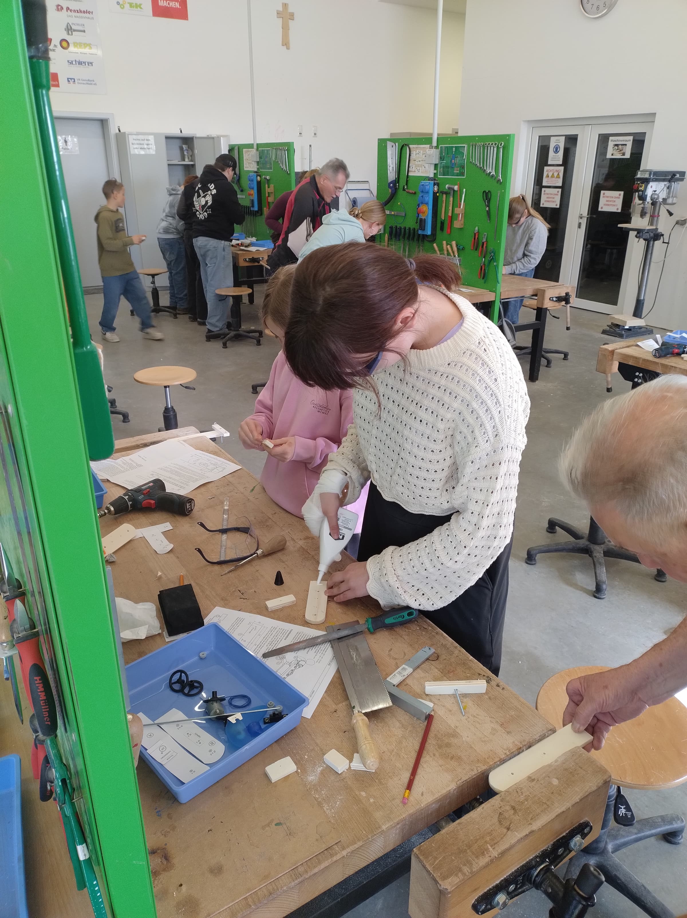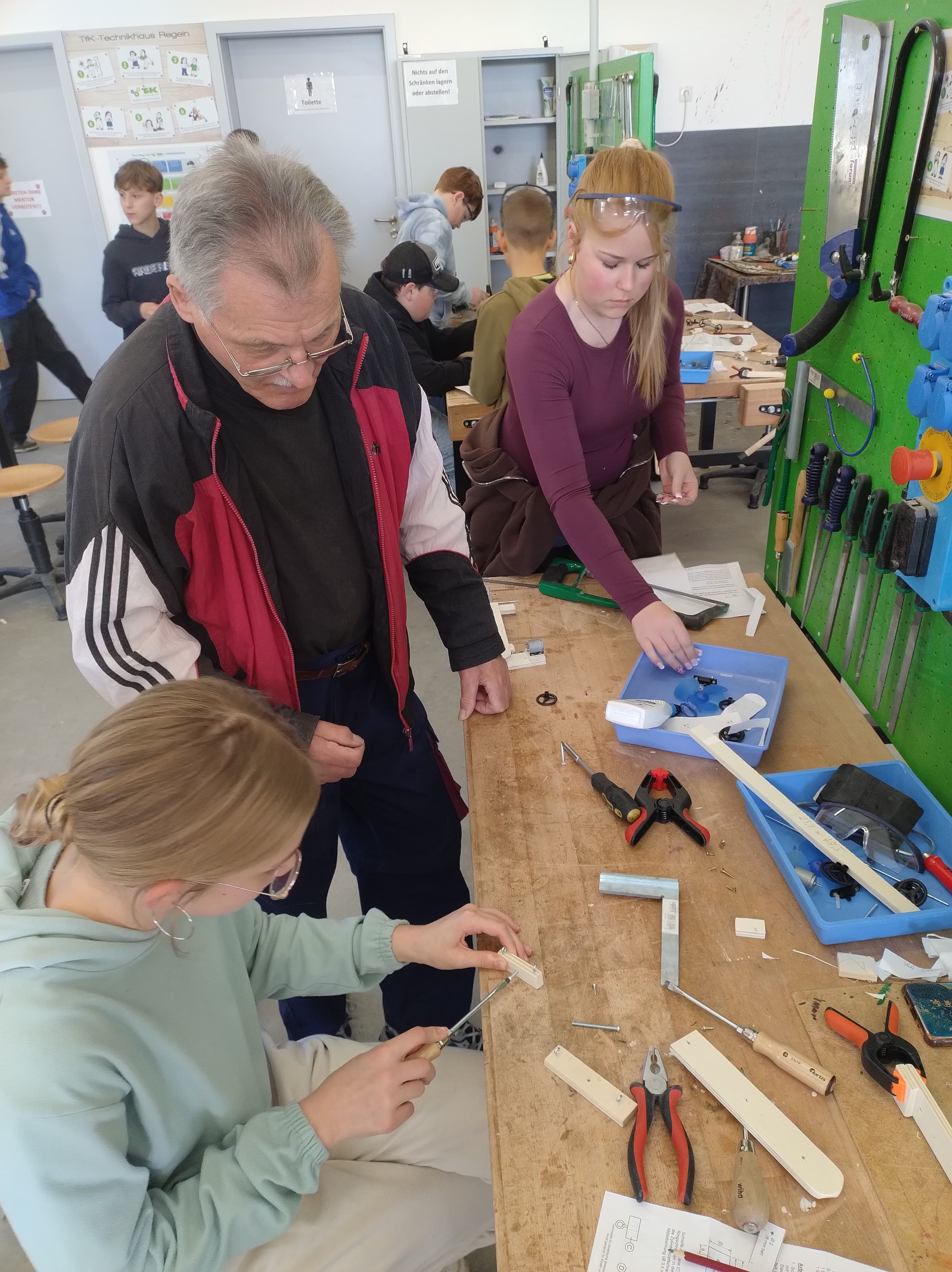 Im Anschluss stand für jedes Kind ein eigener Arbeitsplatz an einer voll ausgestatteten Werkbank zur Verfügung. An diesem wurde eifrig am eigentlichen Projekt des Tages gearbeitet, dem Bau eines Propellerfahrzeugs. Neben der Werkstattleitung wurden die 6. Klässler noch von den drei Mentoren Hans, Gerd und Max unterstützt. Sie sind Handwerker im Ruhestand und engagieren sich für die Förderung des Technikinteresses der Kinder. Sie wollen jungen Menschen die Möglichkeit bieten Technik zu erleben und Werkstücke selbst zu gestalten. Geduldig beantworten sie Fragen, zeigen, wie die Werkzeuge verwendet werden und geben Tipps, wie man den ein oder anderen Fehler vielleicht doch noch beheben könnte.