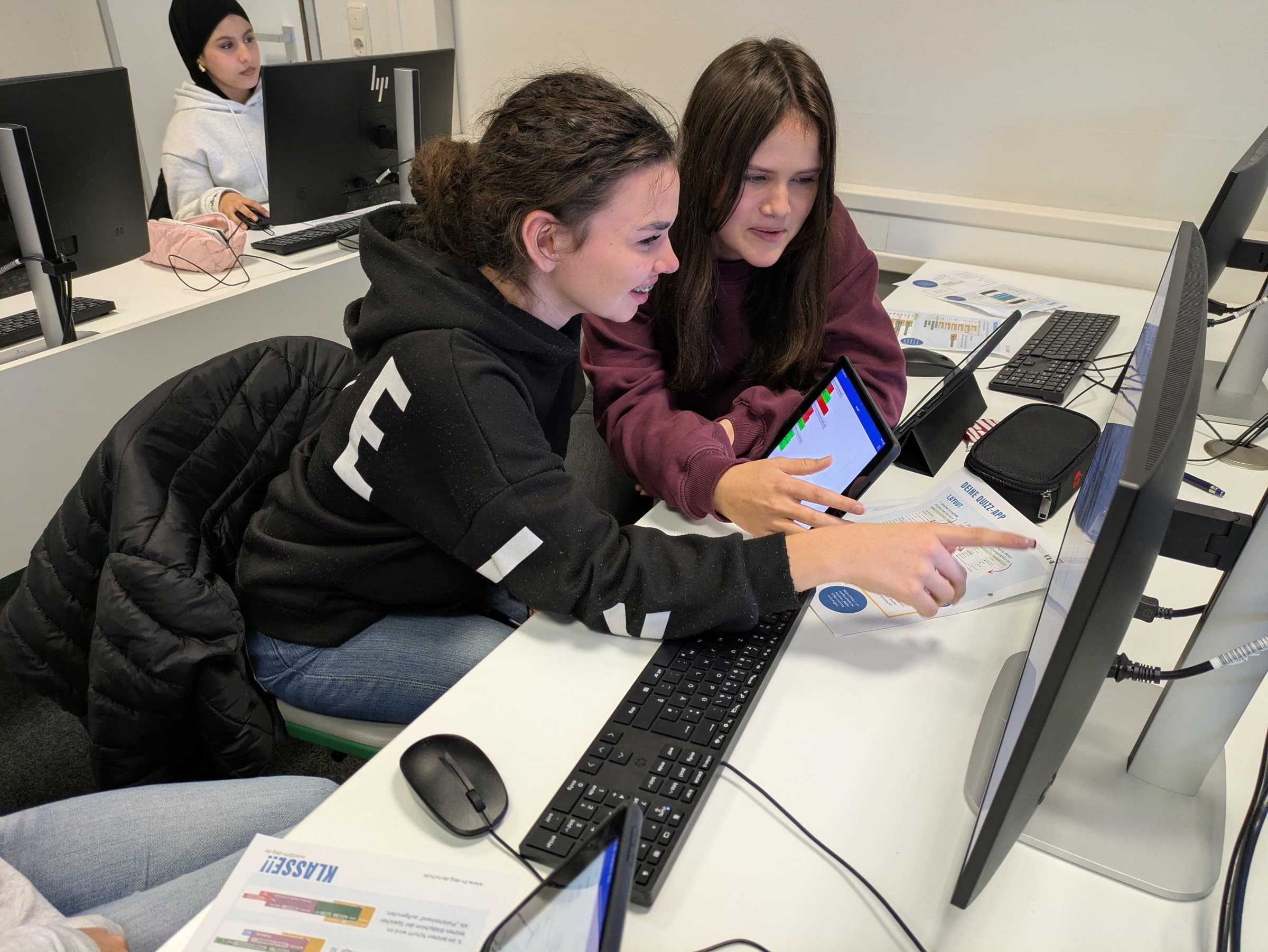 Die Schüler hatten große Freude an der Arbeit mit PC und Tablet und es machte natürlich großen Spaß, die Freunde aus der Klasse mit der eigens erstellten Quiz-App herauszufordern. Die Themen, die in der Quizapp abgefragt wurden, reichten von Musik bis Pferdewissen und Lieblingsspeisen. Ein Schüler wollte von seinen Mitschülern wissen, wo die Currywurst erfunden wurde. Auch Computerspiele lagen hoch im Kurs, wobei sich wohl alle Achtklässler darüber einig waren, dass es sich mit „Clash Royal“ um das beste Spiel handelte.