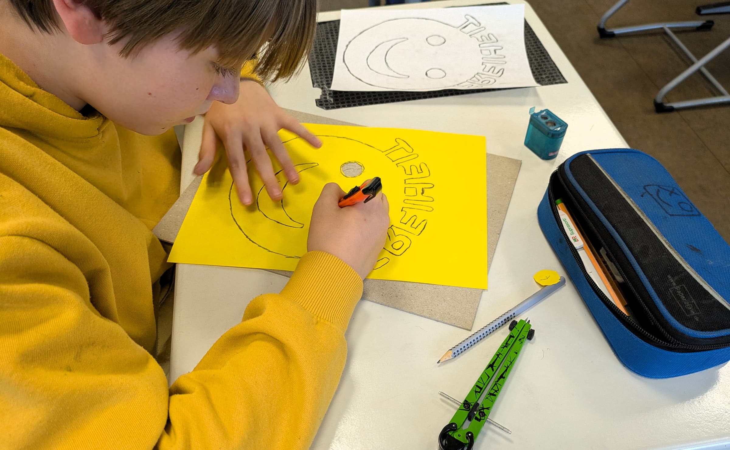 Der Arbeitsprozess ist diszipliniert und erfordert höchste Konzentration. Zu Hause entwickeln die Schülerinnen und Schüler zunächst eine eigene Skizze. Dabei setzen sie sich intensiv mit Symbolen auseinander: Tauben, Pferde oder Delfine stehen in ihren Entwürfen als kraftvolle Sinnbilder für die Freiheit. Andere wählen abstraktere Zeichen wie zerbrochene Ketten, die für die Befreiung stehen, oder eine Feder, die Leichtigkeit und Respekt symbolisiert.