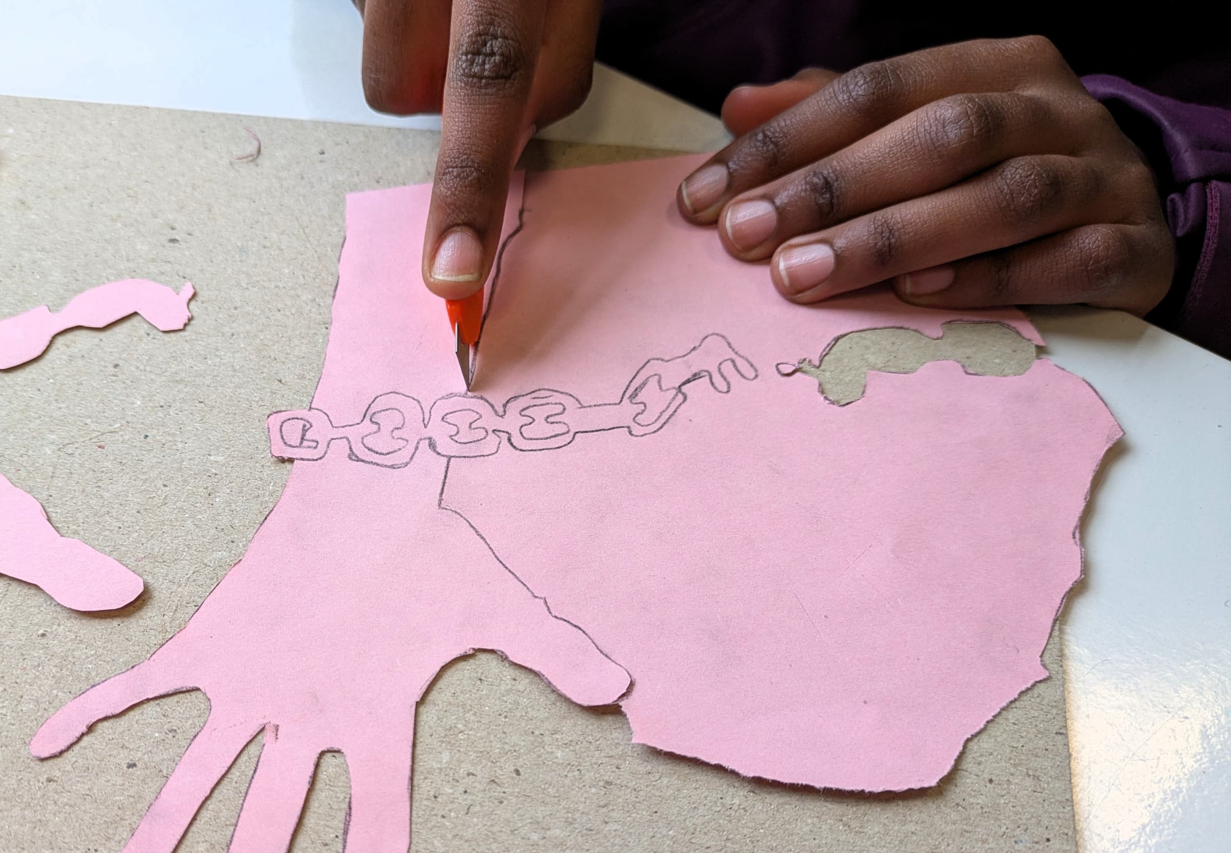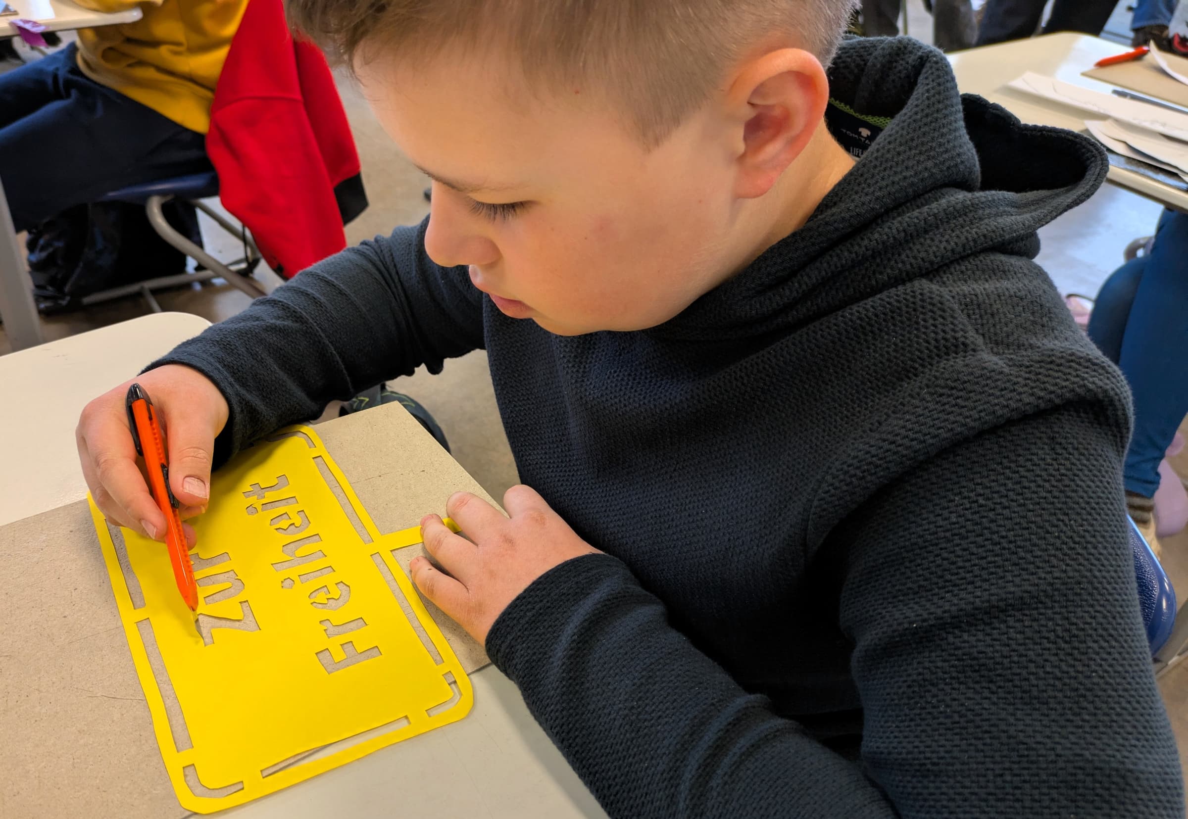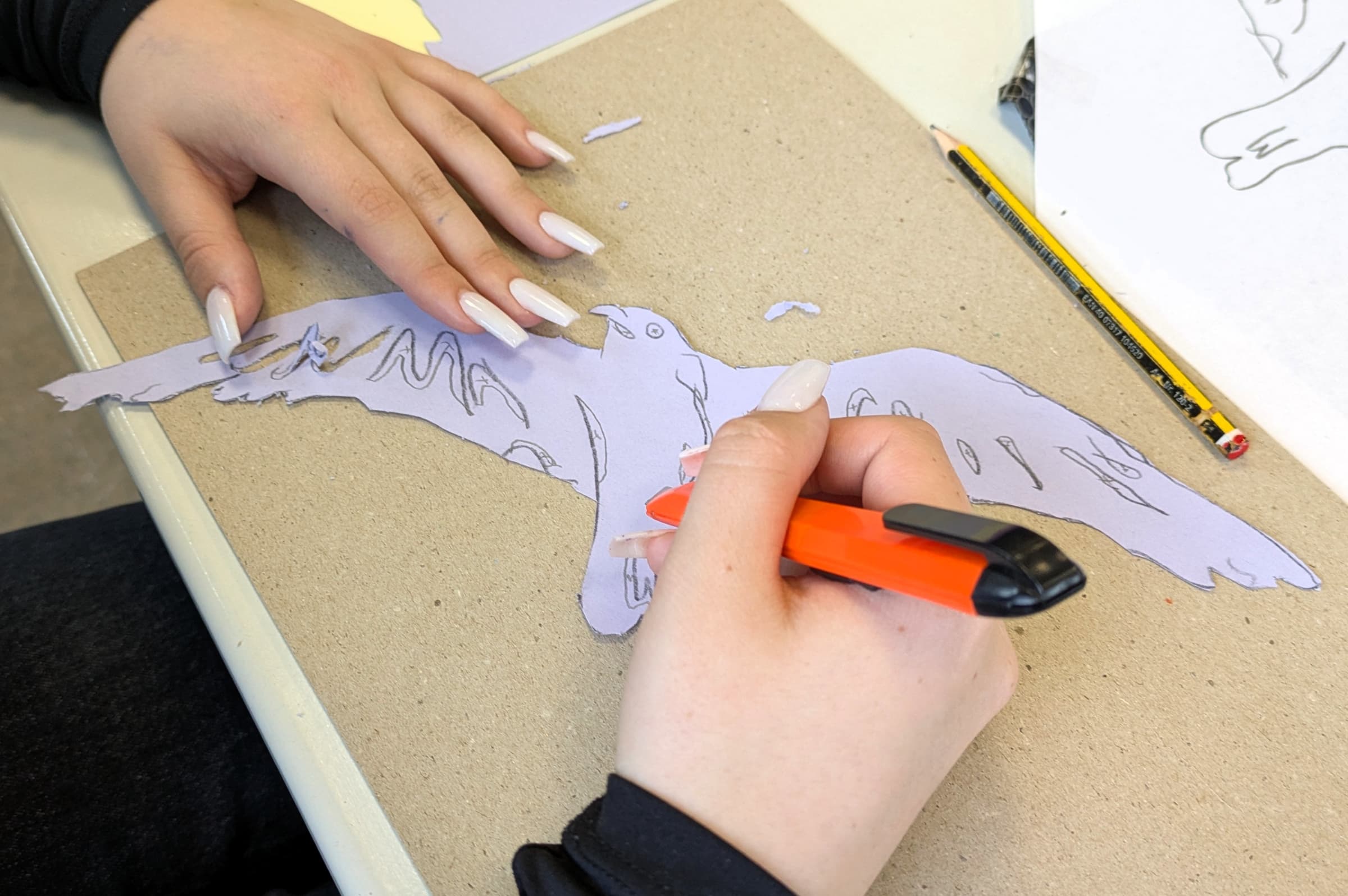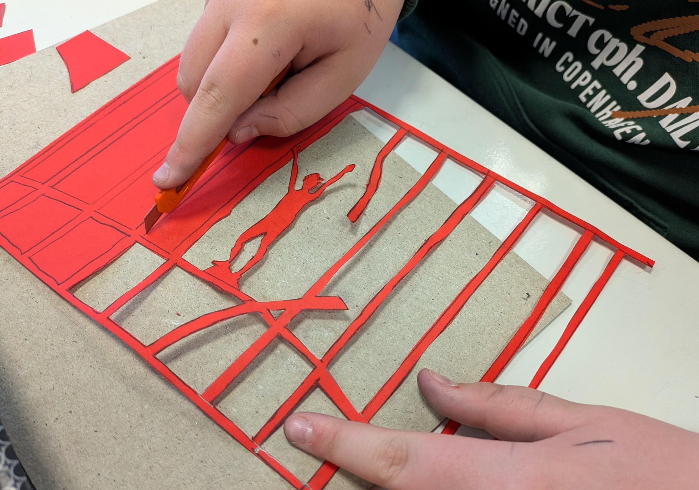 In den beiden wöchentlichen Kunststunden wird es dann ernst: Die Motive werden auf Buntpapier übertragen und anschließend mit scharfen Klingen aus dem Papier herausgearbeitet. Was übrig bleibt, sind fein ausgearbeitete Silhouetten, die durch das Aufkleben auf kontrastfarbenes Papier ihre volle Wirkung entfalten.